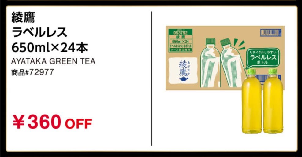 コストコの「綾鷹 ラベルレス 650ml×24本」は、環境に配慮したラベルレス仕様の本格緑茶ペットボトルセット!🍵🌿 急須で淹れたような深みのある味わいが特徴で、日常使いにも来客用にもぴったりな万能ドリンク