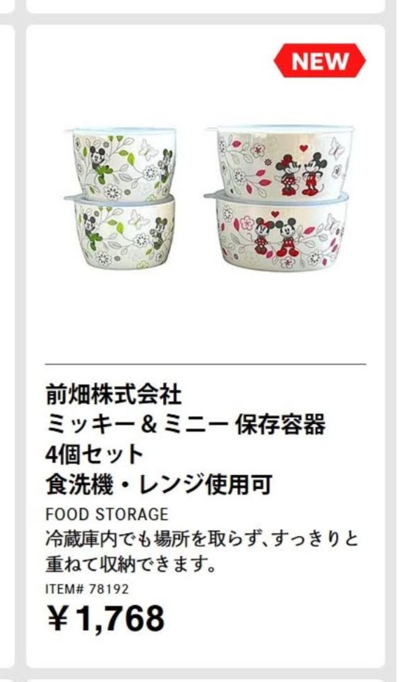 価格:約2,298円(税込)【4個セット】デザイン:ミッキー&ミニーの可愛いイラスト入り。蓋付きでスタッキング収納も可能 機能性:丸みのある形状で洗いやすく、冷蔵庫でも場所を取らない。蓋をしたまま電子レンジOK(※加熱時間に注意)蓋を外せば器としても使えます。🧁