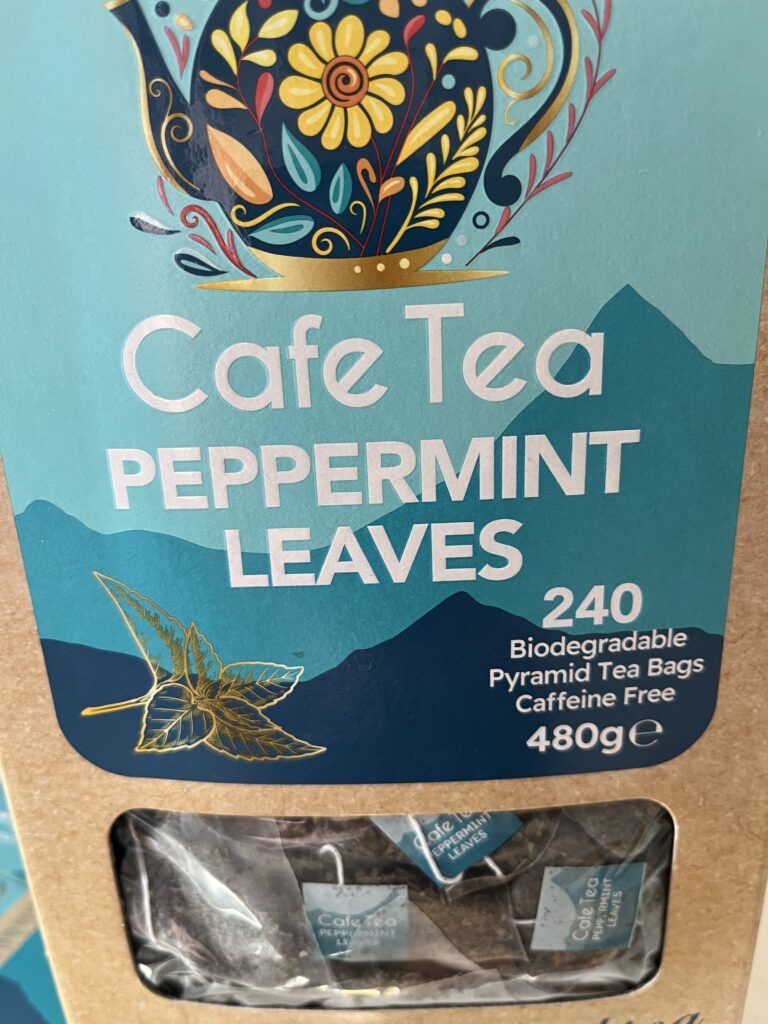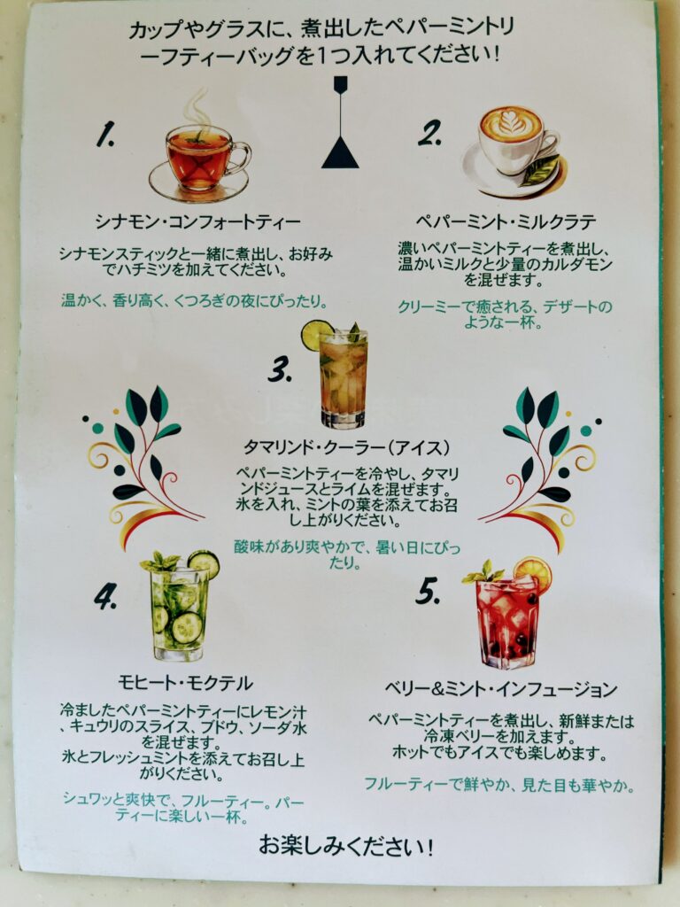 - 原材料:100%ペパーミントリーフ(カフェインフリー)