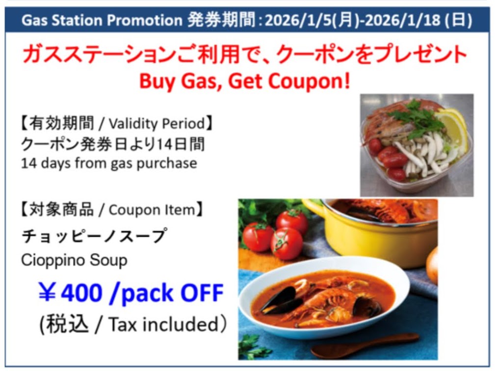 今回はガスステーション利用で貰えるクーポンのチョッピーノスープの紹介でした。😍💕